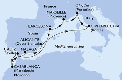 - Genova -> Marseille (Provence) France -> Barcelona Spain -> tengeren -> Cadiz (Seville) Spain -> Casablanca (Marrakech) Morocco -> Malaga (Granada) Spain -> Alicante Spain -> tengeren -> Civitavecchia (Rome) Italy -> Genoa (Portofino) Italy